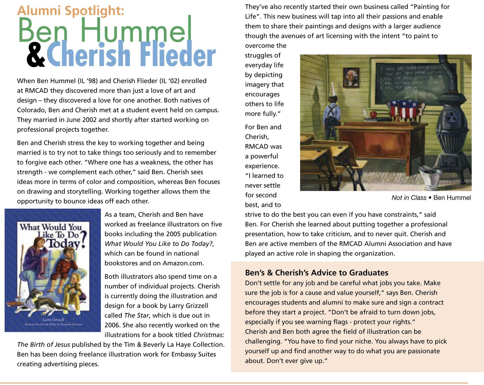 As a team, Cherish and Ben have worked as freelance illustrators on five books including the 2005 publication What Would You Like to Do Today?, which can be found in national bookstores and on Amazon.com. Both illustrators also spend time on a number of individual projects. Cherish is currently doing the illustration and design for a book by Larry Grizzell called The Star, which is due out in 2006. She also recently worked on the illustrations for a book titled Christmas: The Birth of Jesus published by the Tim & Beverly La Haye Collection. Ben has been doing freelance illustration work for Embassy Suites creating advertising pieces.